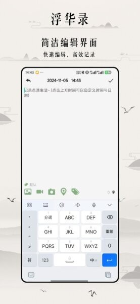 浮华录是一款专注于生活记录的安卓应用,帮助用户通过时间轴的方式有序管理每天的生活点滴。软件界面采用简洁直观的设计风格,配合自定义背景图功能,让用户能打造个性化的记录环境。不同于传统日记应用单一的输入形式,浮华录支持图文混合编辑,用户可以方便地插入照片和文字,定格生活中的精彩瞬间。其时间轴页面一览无遗地展示了每一天的所有记录,方便用户按时间顺序回顾过去的生活轨迹。