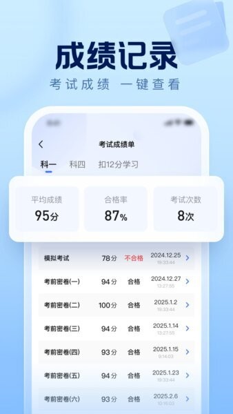 成绩记录自动保存每次练习和模拟考试的得分,用户可以查看详细统计,分析自身实力和薄弱环节,有针对性地调整学习计划。