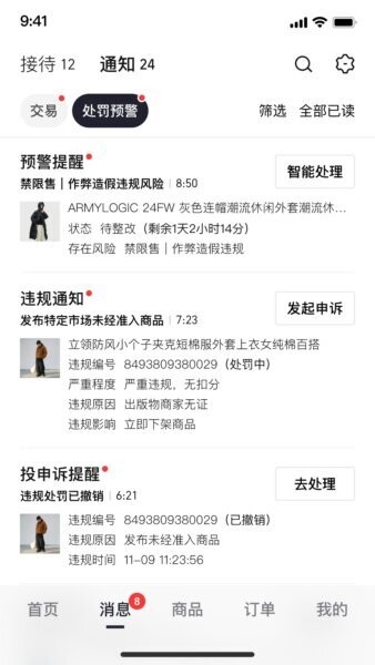 当系统检测到违规时,APP会推送预警通知,商家可以点击进入查看具体原因并提交申诉,及时处理以保护店铺权益。