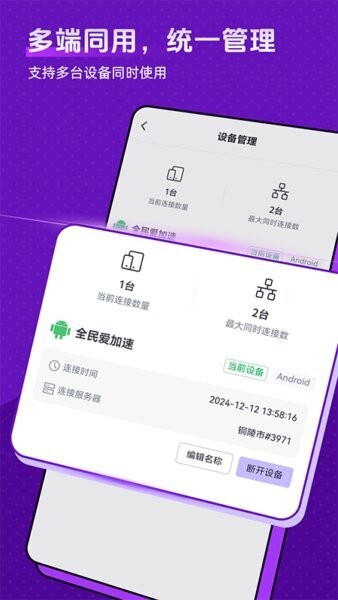 多设备统一管理。用户可以在多个设备上使用同一账户进行网络加速,并在设备管理界面查看当前连接设备状态。