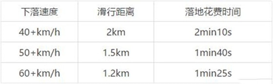 经过测试在40km/h时的滑行距离最远,达到了2km,大于和小于40km都会较小滑行距离,并且小于40km/h的速度时,滑行的时间太长,严重影响降落效率,因此如果选择“呼吸跳伞法”,保持40km/h的速度可以达到现在版本最远的2km,也就是地图上两个大格的距离。