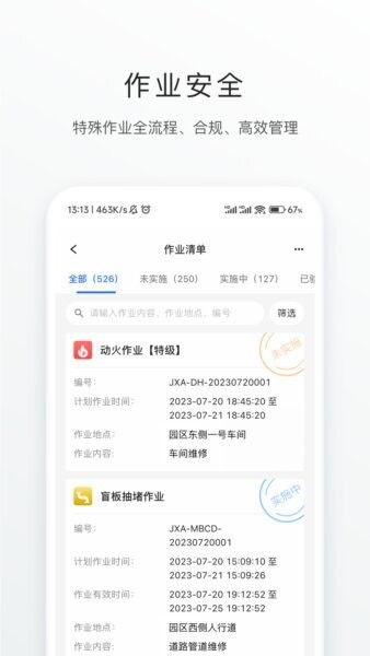 作业票模块支持多类别作业申请和审批,特别针对高危特殊作业实现流程闭环,确保作业安全合规,同时支持随时查看和管理作业状态。