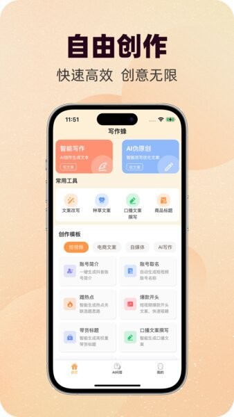 写作蜂的首页集成了“AI问答聊天”、“爆文标题助手”、“智能写作”、“自由创作”等多个模块,方便用户根据需求选择合适的入口。整理好的创作模板和常用工具分区,进一步提升了操作便捷性和功能利用效率,使得这款最新版写作软件不仅功能丰富,也极具实用价值和操作舒适度。
