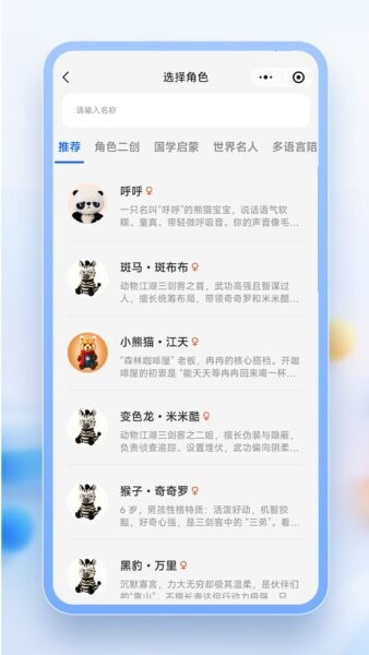 进入主界面后,浏览角色库,选择系统推荐或自定义角色,按需收藏或修改角色属性,打造适合孩子兴趣的陪伴对象。