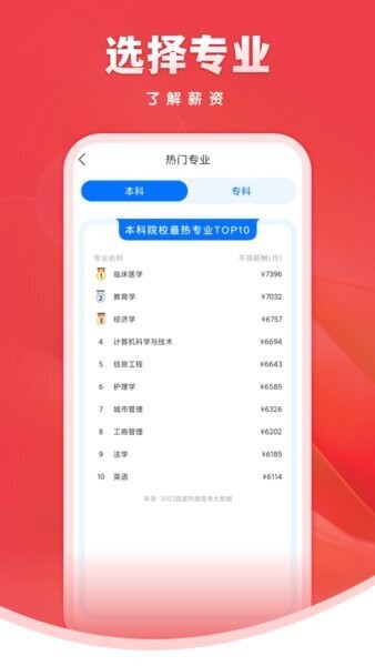 软件内置最新的专业薪酬排行榜,展示本科及专科热门专业的平均月薪,帮助用户了解行业趋势和职业前景。