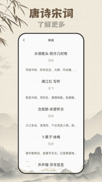 针对每首诗词的作者,应用提供详细查询入口,介绍作者生平及文学成就,有助于用户从作者视角理解作品背景,提升文学鉴赏层次。这一功能在文化学习和研究中具有重要价值。