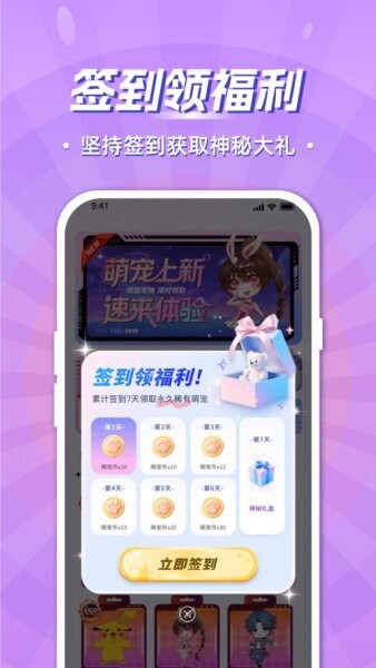 每日签到可获取积分和礼品,累计签到七天还可领取永久稀有宠物,激励用户长期活跃,丰富养成过程。