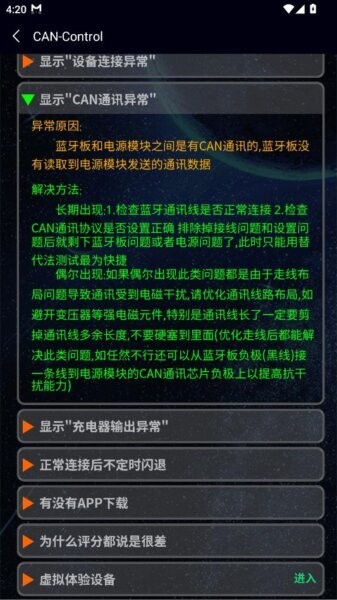 CAN蓝牙是一款专注于CAN通讯设备管理的安卓客户端,主要服务于车辆充电桩和相关取电设备的连接与故障检测工作。它不仅支持蓝牙自动搜索和连接管理,还集成了针对CAN通讯协议的深度故障排查功能,能够实时监测各类通讯和设备异常状态。软件界面直观,用户通过简单操作即可完成设备的发现、连接及诊断,极大提升调试效率。