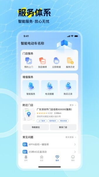 应用集成了门店预约、维修、救援服务入口,用户可以直接通过APP预约上门维修或选择到店服务,管理历史订单和服务记录。这种无缝对接线下服务的设计,极大地方便了用户对车辆维护的需求,提升售后服务效率。