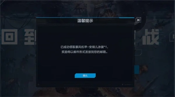 【暴风机甲一安琪儿涂装】奖励说明:完成领取后记需回到游戏账号内,前往游戏主界面-邮箱,完成奖励领取。