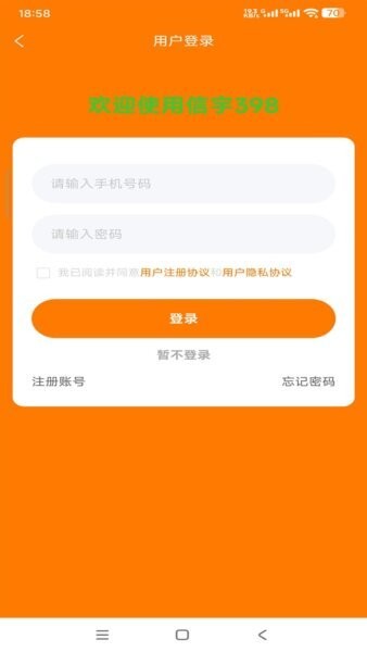 适用人群主要包括日常家庭采购者、办公人员及小型商户,软件通过完善的用户登录与注册机制确保账户安全,同时支持订单管理、余额查看和协议查阅等功能,帮助用户全方位掌控购物过程。软件采用温暖而活泼的配色方案,突出节日氛围和促销活动元素,使用户感受到购物的轻松和愉悦。此外,信宇398中的“我的订单”模块根据订单状态细分,便于用户随时查看待付款及待发货商品,极大提升了购物后续服务的透明度和效率。