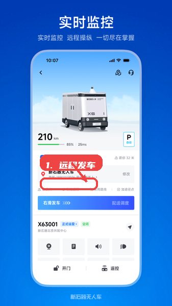 在实时监控界面,选择指定车辆,右滑发车按钮即可远程启动无人车,操作便捷且响应快速。