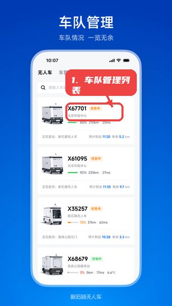 列表中显示车辆基本信息及当前状态,包括任务进度、充电情况等,方便统一查看与管理。