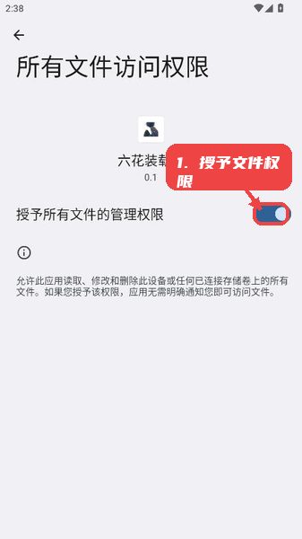 打开六花装载机后,系统会提示用户开启文件管理权限,点击权限开关,授权应用访问设备存储文件,确保后续功能正常使用。
