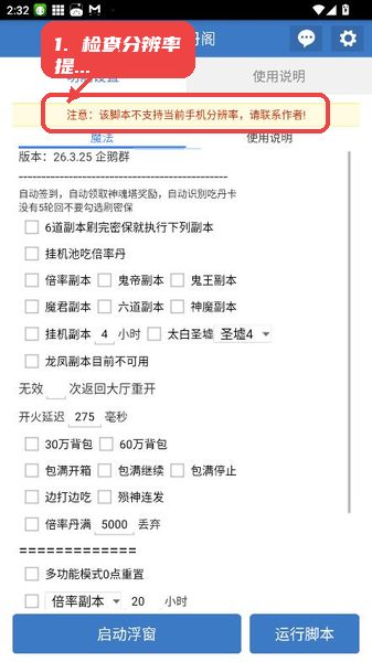 进入功能设置页查看分辨率提示信息,若提示不支持当前手机型号,建议联系作者获取兼容版本,保证运行稳定。