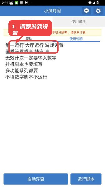 这款应用特别适合那些希望通过自动化脚本提升游戏效率的用户,尤其是需要频繁参与副本挑战或管理背包空间的玩家。软件设置界面中明确提示当前手机分辨率兼容性,保证运行环境的安全与稳定;用户在首次使用时,可以根据指导页面调整游戏画质和帧率设置,优化脚本运行效果。整体来看,小风丹阁不止是一款简单的辅助工具,更细致地结合了用户实际游戏需求和操作习惯,为安卓用户带来便捷高效的游戏体验。