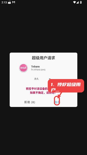 Tnhere首次启动时弹出的超级用户权限请求界面,允许用户选择永久授权或拒绝,为后续的游戏数据编辑提供了坚实的权限基础。该权限管理不仅保证了软件能深度接入系统级资源,还避免了重复授权的繁琐,提升了用户整体体验的便利性和安全性。