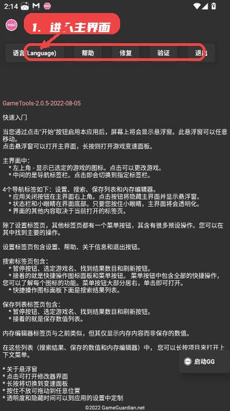 完成权限授予后,进入GameTools主界面,顶部功能按钮栏展示所有核心功能入口,同时快速入门指南帮助新用户初步了解操作流程。