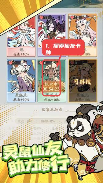玩家通过收集和管理仙友卡牌,卡牌在探索状态完成后解锁,相应的属性加成立即生效,帮助角色更快成长。