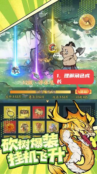 刚进入游戏,应重点关注首页角色界面,了解当前境界和等级,熟悉“渡劫”按钮位置。渡劫是突破实力瓶颈的关键,初期通过简单任务和砍树积累资源准备渡劫条件。