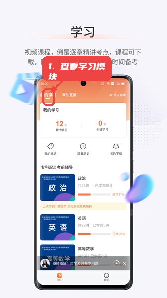 鹿学士是一款面向成人学历提升的线上学习平台,特别聚焦于帮助专科起点或成人高考考生通过系统化学习完成本科学士学位。该应用以丰富的视频课程和直播教学为核心,辅以课堂标记和知识点管理功能,力求为用户打造高效便捷的学习环境。页面布局分明,将“我的课程”“我的直播”“标记”等主要功能模块集中呈现,方便用户快速进入学习状态。