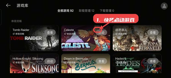 在游戏库首页,你可以看到游戏分为“体验流畅”、“未验证”和“暂不支持”类别。根据设备性能和个人需求,优先选择“体验流畅”的游戏进行游玩,点击对应卡片可了解更多详情或直接启动游戏。