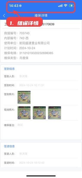 点击工单条目,打开详细页面查看签到和签退时间、维保类型等详细信息,明确现场工作重点和要求。