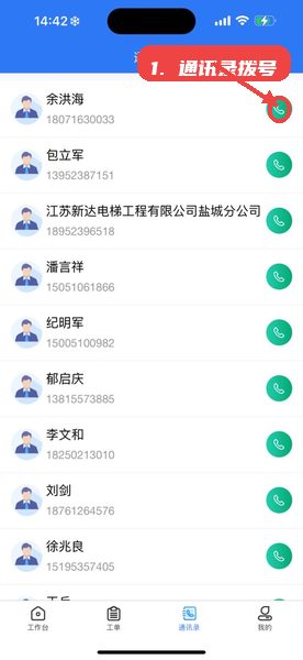 在通讯录模块中浏览联系人列表,点击旁边绿色电话按钮即可快速拨打电话,方便联系客户、同事或上级,安排维保事宜。