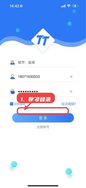 打开盐城梯梯维保APP,选择所属城市,输入账号和密码后点击登录。首次使用时可以勾选记住密码,方便下次快速进入系统。