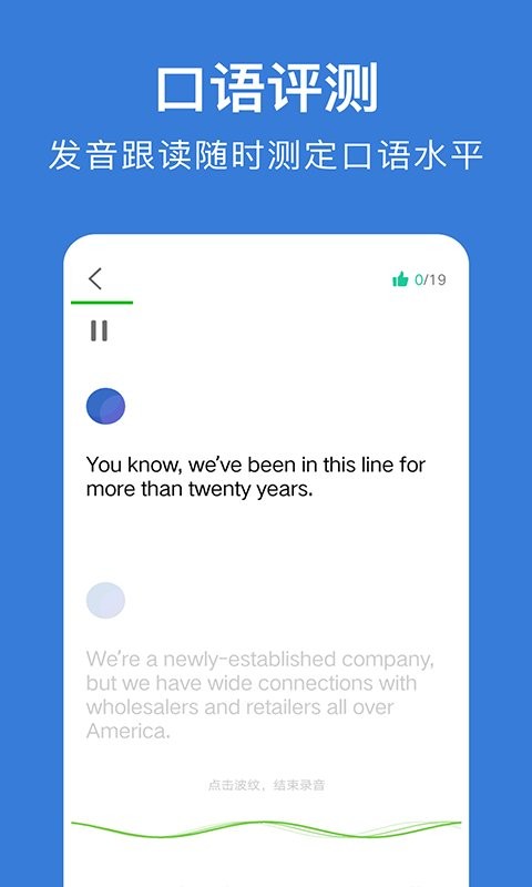 真人播音,循环复读,您可以跟着外教一起读,外教读一句,您模仿一句,app会将您朗读的句子录音并回放,逐字逐句纠正您的口语发音。本软件评测系统源于剑桥大学的英文语音评估系统。对您朗读得英文准确评分,精确到每个单词。