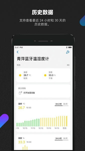 支持添加青萍家用智能设备,添加后您可查看室内多种环境数值、历史数据、解读。