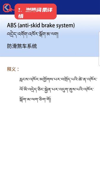 在搜索结果中点击词条进入详情页,查看藏汉英对照释义。可通过页面左上角的返回按钮返回搜索页面,继续查询其他内容。