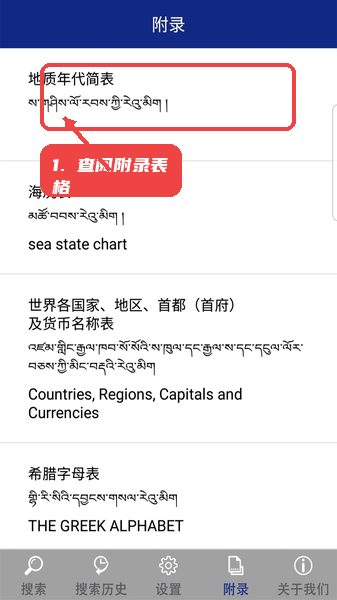 从底部导航切换到附录,选择所需的专业表格,如地质年代简表,查看相关内容,辅助理解专业术语。