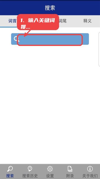 打开应用后,点击首页的搜索框,输入想要查询的词汇,可以选择词首、词中、词尾或释义作为搜索维度,方便定位目标词条。