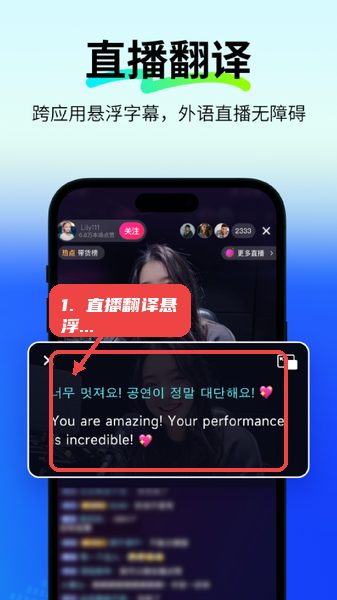 支持直播视频跨应用悬浮显示翻译字幕,方便用户在观看外语直播时同步理解内容,适合外语直播和在线教学环境。