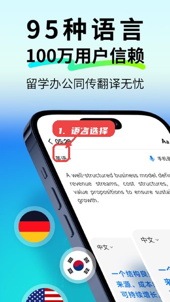 打开应用主界面,在语言下拉菜单中切换源语言和目标语言,支持95种语言互译,适用于不同国家和地区的用户。