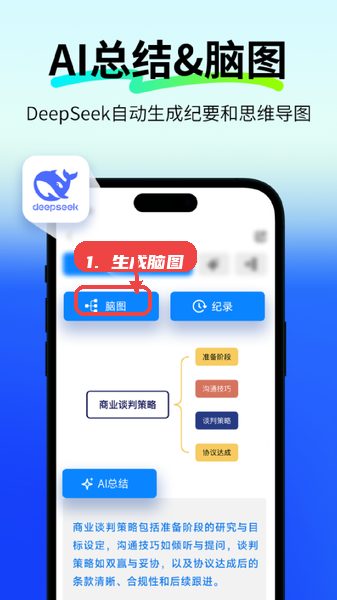 在需要整理会议纪要或讲座内容时,点击“脑图”按钮,应用会自动梳理重点并生成结构化思维导图,辅助信息回顾。