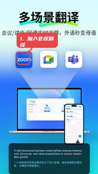点击对应的会议平台图标(如Zoom),应用会在会议中自动提供实时字幕翻译,提升跨语言沟通效率。
