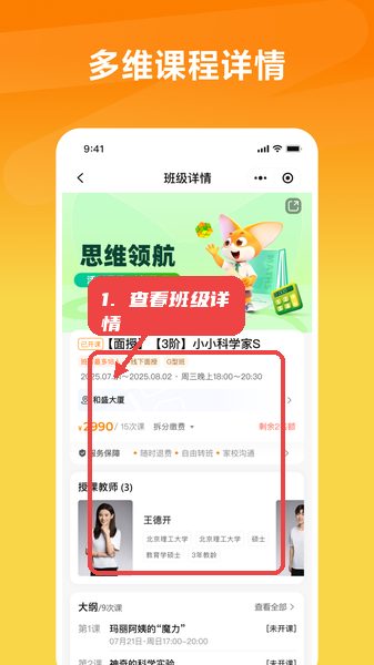 点击具体课程进入详情页面,查看课程的时间安排、授课教师和大纲,判断是否符合自己的需求。