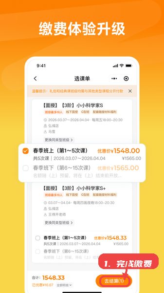 试听满意后,将课程添加至选课单,进入缴费页面点击“去结算”按钮,完成报名支付流程。