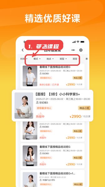 列表页提供时间、上课模式等筛选条件,帮助用户精准筛选合适的课程,提升选择效率。
