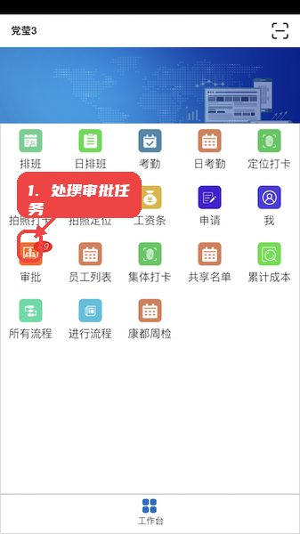 功能菜单中设有审批入口,显示当前待办数量。用户点击审批图标后,可进入审批列表,处理各类请假、调班等申请,帮助企业规范流程管理。