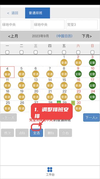 应用提供普通排班界面,支持按日历查看并调整班次。通过“全选”按钮,管理者或排班负责人能快速批量选中多天班次,便于批量排班和修改。