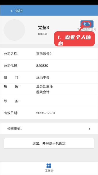 员工可以在个人信息界面查看姓名、工号、公司部门和职位等内容,并支持上传头像更新。通过右上角上传按钮,用户能够替换个人照片,使资料保持最新状态。