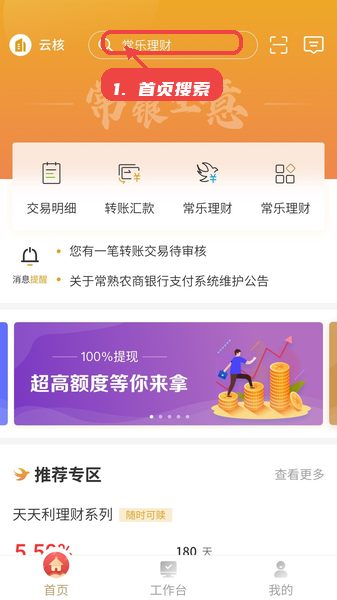 打开应用首页,在顶部搜索框输入关键词(如“常乐理财”),快速查找所需服务入口,避免逐项浏览,提高操作效率。