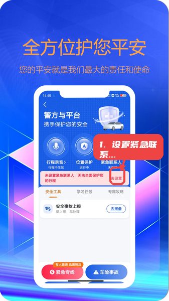 在安全功能区点击“去设置”,添加紧急联系人,提升行程安全保障。