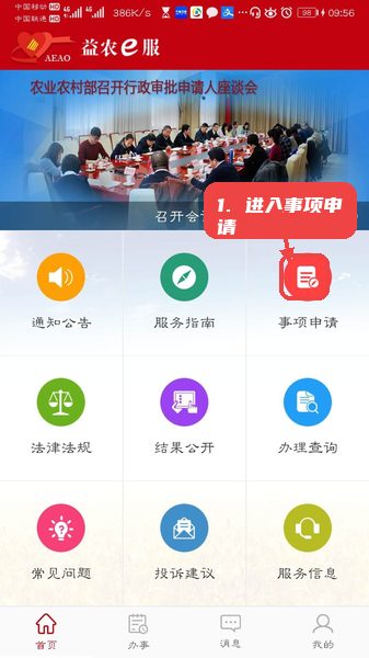 登录后首页显示多个服务入口,点击“事项申请”进入具体的农业审批办理流程。