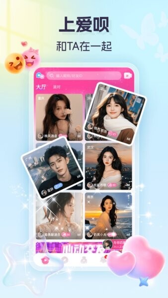 爱呗交友相亲平台是一款面向手机用户的社交应用,主要用于在线交友和互动娱乐。用户打开应用后,可以在首页通过搜索框输入昵称或好友ID,快速找到感兴趣的人。首页还设有大厅和派对两个入口,方便参与不同形式的社交活动。适合希望通过多种方式认识新朋友、扩大社交圈的年轻群体。应用内涵盖多种实时互动场景,如直播、多人K歌和七人天使交友,满足多样交流需求。