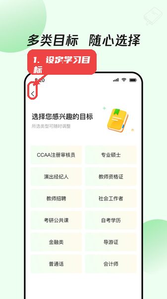 进入目标选择页面,根据个人备考或专业提升需求选择相应的学习方向,必要时可通过左上角返回按钮调整选择。