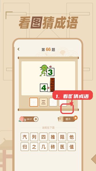 打开看图猜成语栏目,根据图片和文字线索输入答案,必要时点击提示获得线索。